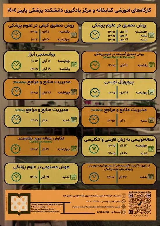 کارگاه‌های آموزشی سال 1404 واحد آموزش و توانمندسازی کتابخانه و مرکز یادگیری دانشکده پزشکی همزمان برگزار خواهد شد.