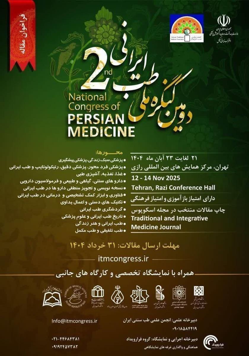 به استحضار می رساند دومین کنگره ملی طب ایرانی به همت انجمن علمی طب سنتی ایران و حمایت دفتر طب ایرانی وزارت بهداشت در تاریخ ۲۱ الی ۲۳ آبان ماه سال جاری در مرکز همایش های رازی برگزار خواهد شد. مهلت ارسال چکیده مقالات تا ۳۱ خرداد ماه است و علاقمندان می توانند جهت ثبت نام و کسب اطلاعات بیشتر از طریق سایت همایش به آدرس https://itmcongress.ir اقدام نمایند.