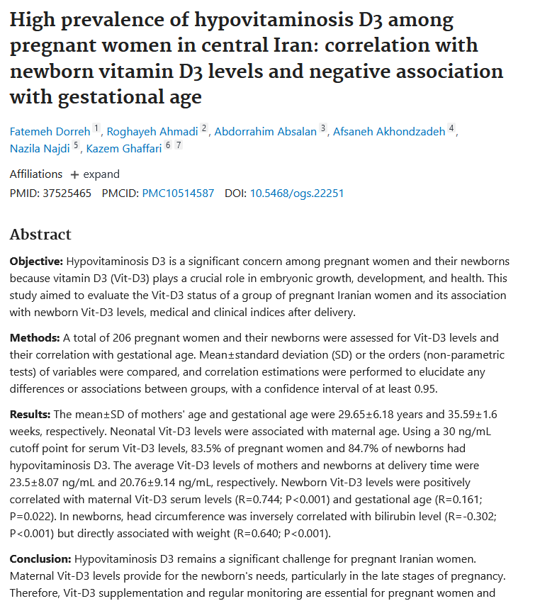 | High prevalence of hypovitaminosis D3 among pregnant women in central Iran: correlation with newborn vitamin D3 levels and negative association with gestational age |