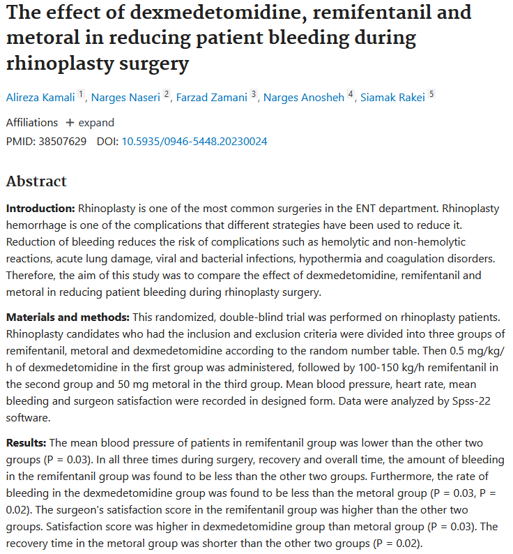 | The effect of dexmedetomidine, remifentanil and metoral in reducing patient bleeding during rhinoplasty surgery |