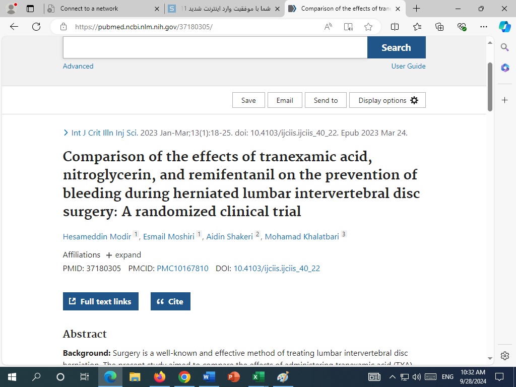 | Comparison of the effects of tranexamic acid, nitroglycerin, and remifentanil on the prevention of bleeding during herniated lumbar intervertebral disc surgery: A randomized clinical trial |