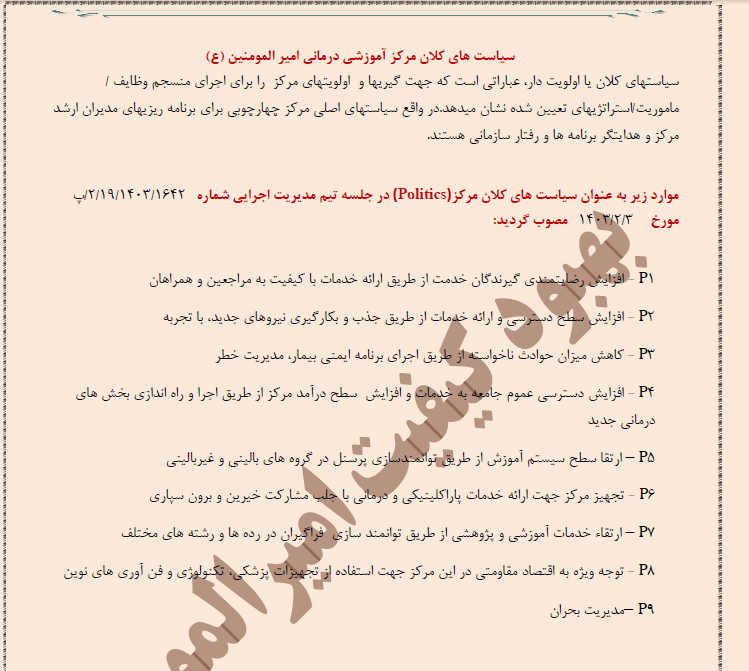 سیاست های کلان مرکز آموزشی درمانی امیرالمومنین (ع)