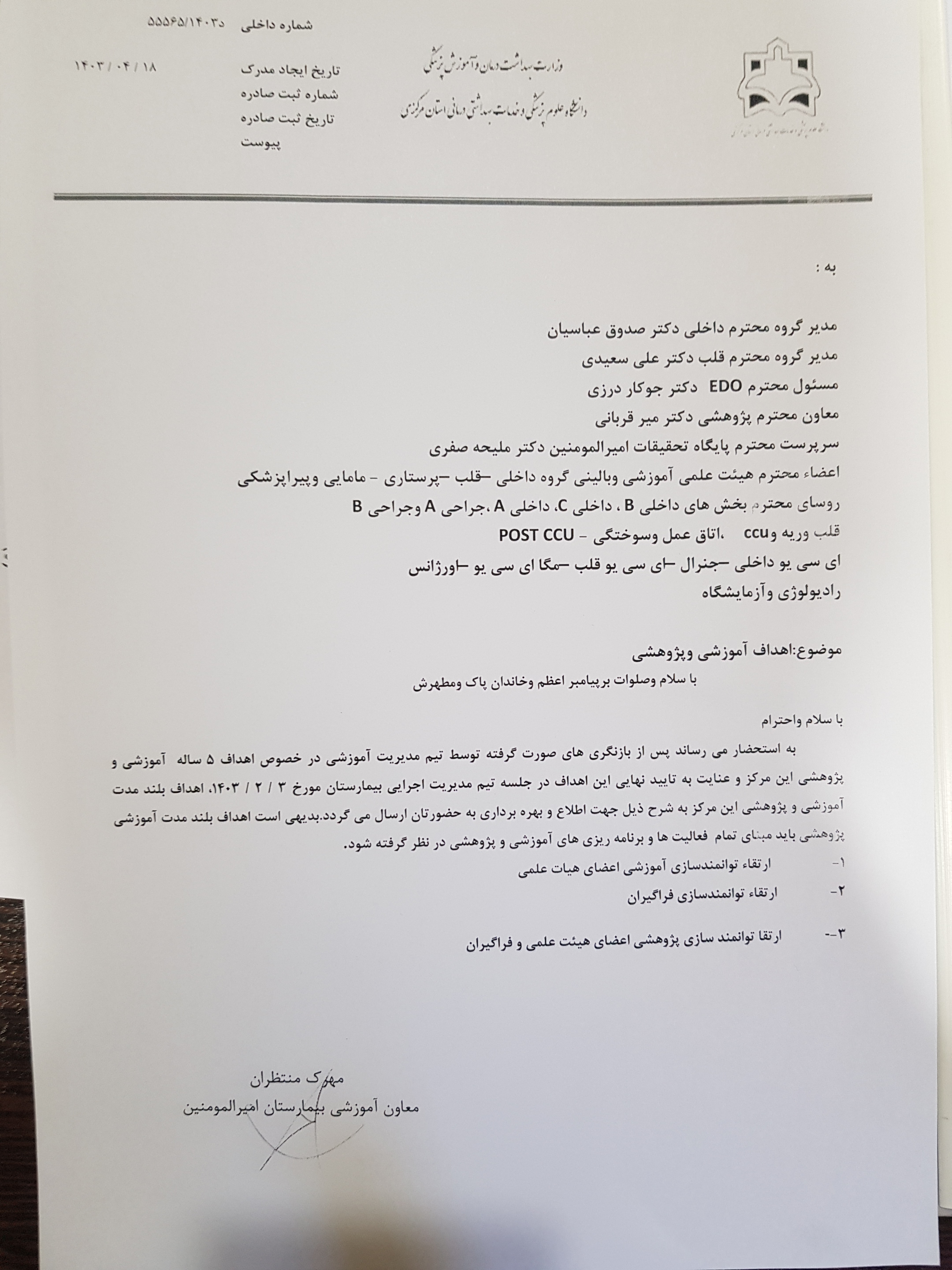 ابلاغ سند استراتژیک مرکز آموزشی درمانی امیرالمومنین (ع)