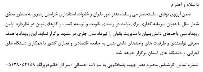 بنابر اعلام مدیر کل امور زنان و خانواده خراسان رضوی، رویداد ملی واحدهای دانش بنیان با مدیریت بانوان در تیر ماه سال جاری در مشهد برگزار می گردد.