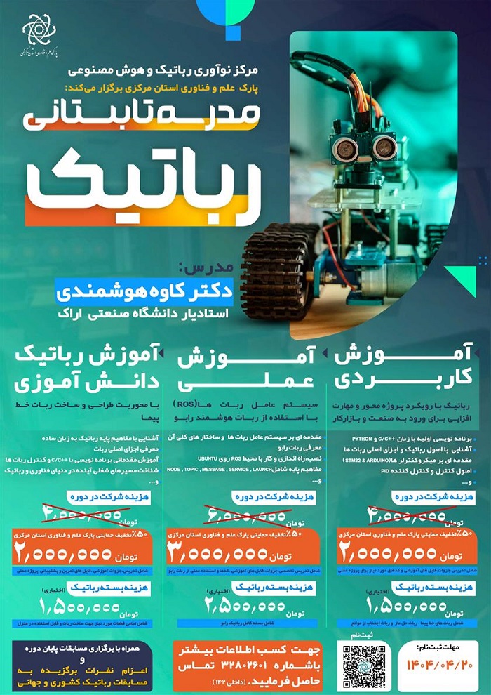 به اطلاع می رساند، مرکز نوآوری رباتیک و هوش مصنوعی پارک علم و فناوری استان مرکزی در راستای توسعه مهارت های علمی و فنی نسل جوان اقدام به برگزاری مدرسه تابستانی رباتیک نموده است. این دوره تخصصی با بهره گیری از آموزش های کاربردی کارگاه های عملی و محتوای جذاب ویژه دانش آموزان و دانشجویان علاقه مند طراحی شده است.