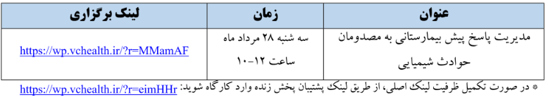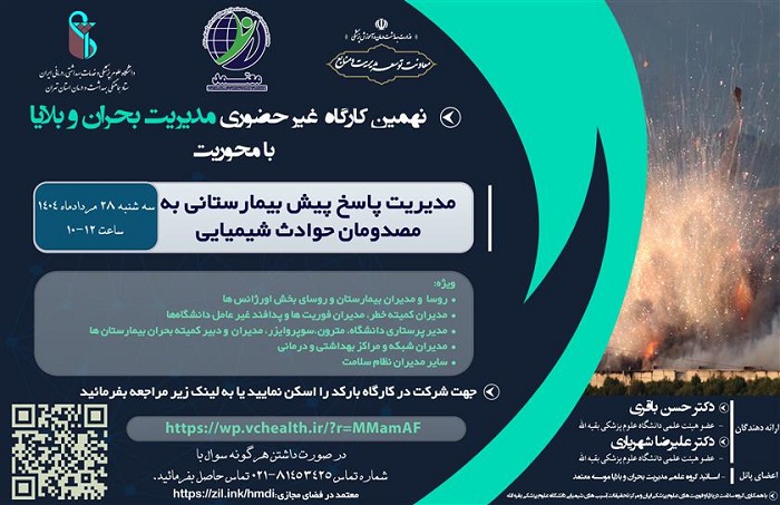 برگزاری کارگاه های غیرحضوری مدیریت بحران و بلایا با محوریت مدیریت پاسخ پیش بیمارستانی به مصدومان حوادث شیمیایی