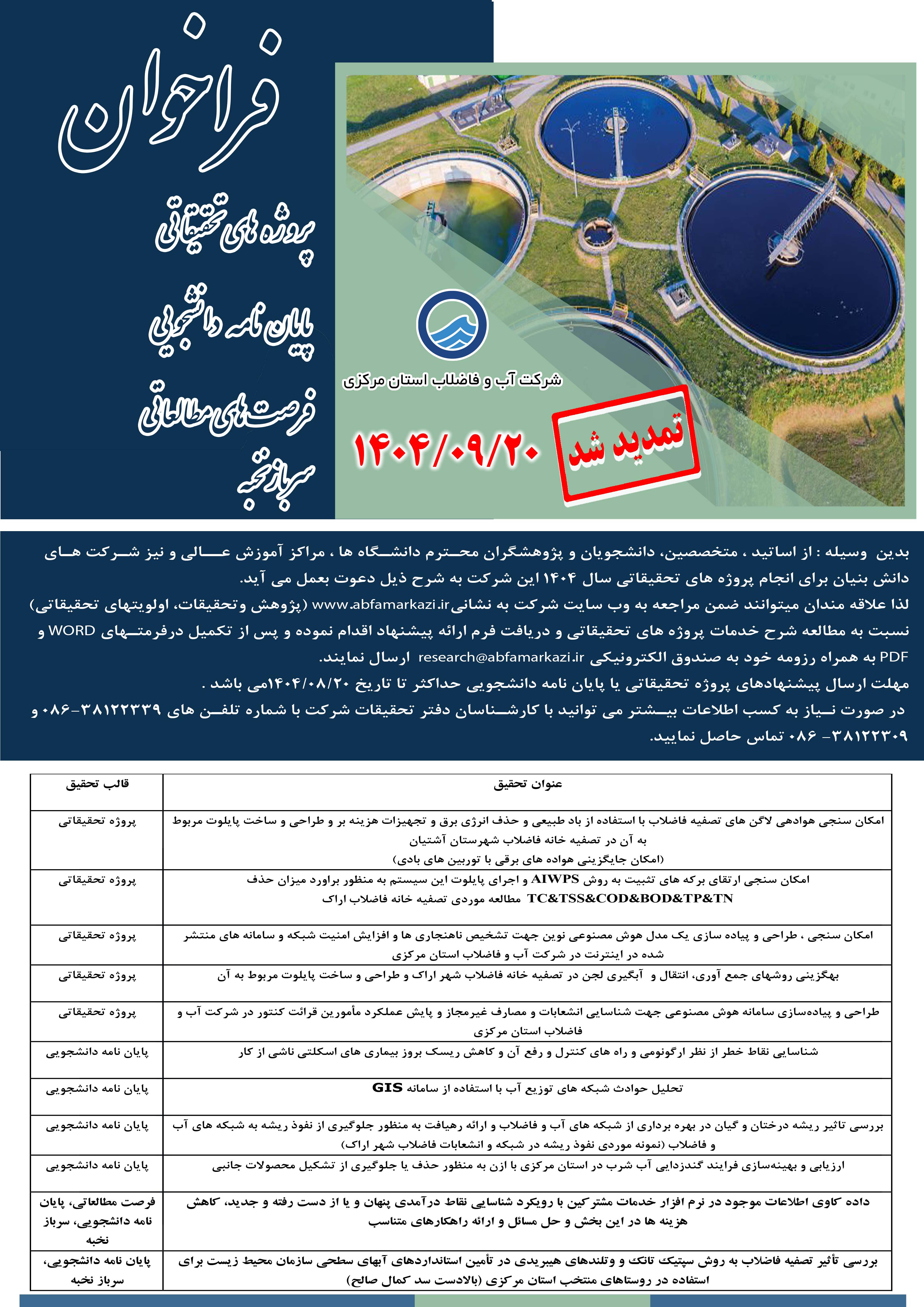 تمدید مهلت ارسال پروپوزال اولویت های تحقیقاتی شرکت آب و فاضلاب استان مرکزی ۰۱ آذر ۱۴۰۴ | ۰۸:۱۱ کد : ۵۶۴۲۹ اخبار ارسال به دیگران نام شما ایمیل شما ایمیل دریافتکننده ارسال انصراف تعداد بازدید:۵۸ بدونوسیله به اطلاع میرساند مهلت ارسال پروپوزال اولویت های تحقیقاتی شرکت آب و فاضلاب استان مرکزی تا ۲۰ آذرماه تمدید گردیده است. جهت دانلود پوستر کلیک کنید