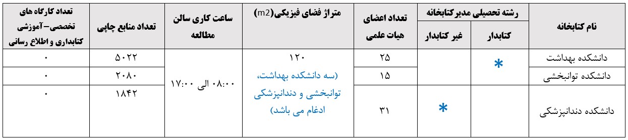 کتابخانه دانشکده های بهداشت و توانبخشی ابتدا از سال 1390 فعالیت خود را با مجموعه کتابهای حوزه بهداشت زیر نظر کتابخانه مرکزی آغاز نموده است. سپس در سال 1391مجموعه کتابهای تخصصی رشته های مرتبط با توانبخشی مجموعه خود را گسترش داد.