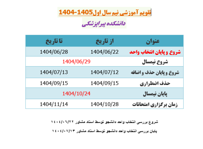 زمان انتخاب واحد در نیمسال اول 1405-1404طبق جدول زیر از 1404/06/22 لغایت 1404/06/28 و شروع کلاسها از 1404/06/29 می باشد.دانشجویان گرامی جهت انتخاب واحد در تاریخ ذکر شده به سامانه هم آوا مراجعه نمایند.