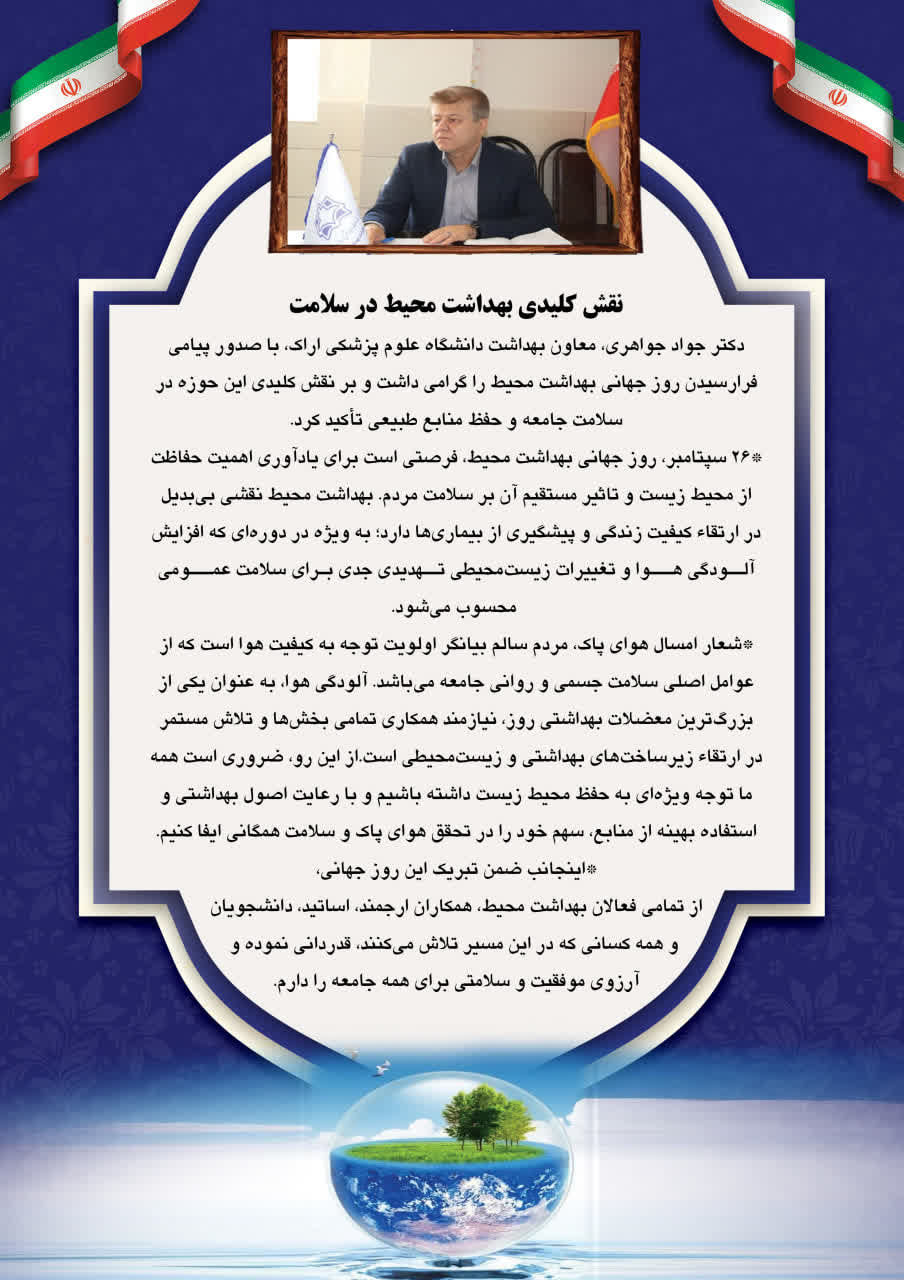 اینجانب ضمن تبریک این روز جهانی، از تمامی فعالان بهداشت محیط، همکاران ارجمند، اساتید، دانشجویان و همه کسانی که در این مسیر تلاش میکنند، قدردانی نموده و آرزوی موفقیت و سلامتی برای همه جامعه را دارم.