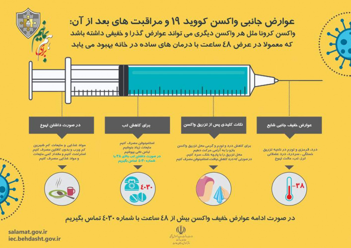 واکسن کرونا مثل هر واکسن دیگری میتواند عوارض گذرا و خفیفی داشته باشد.که معمولا در عرض ۴۸ ساعت با درمان های ساده در خانه بهبود می یابد.