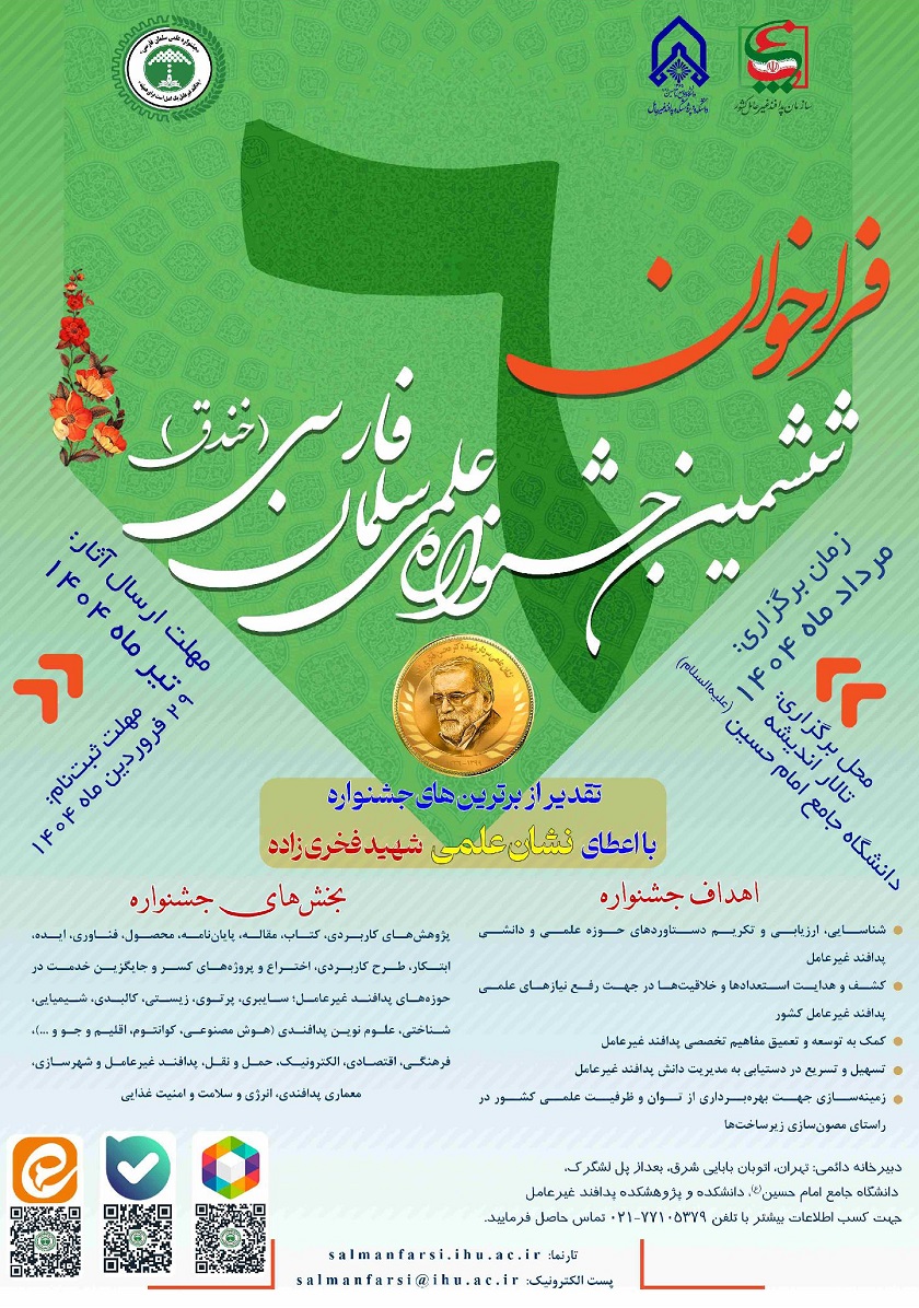 به اطلاع می رساند، سازمان پدافند غیرعامل کشور با مشارکت دانشگاه جامع امام حسین (ع) با اهداف شناسایی، ارزیابی، معرفی و ارج نهادن به مقام والای دانش آموختگان، پژوهشگران، مبتکران، مخترعان و مولفان آثار برگزیده و برتر در حوزه پدافند غیرعامل، ششمین  جشنواره علمی سلمان فارسی (خندق) را در مرداد ماه 1404 برگزار می نماید. پوستر جشنواره پیوست می باشد.