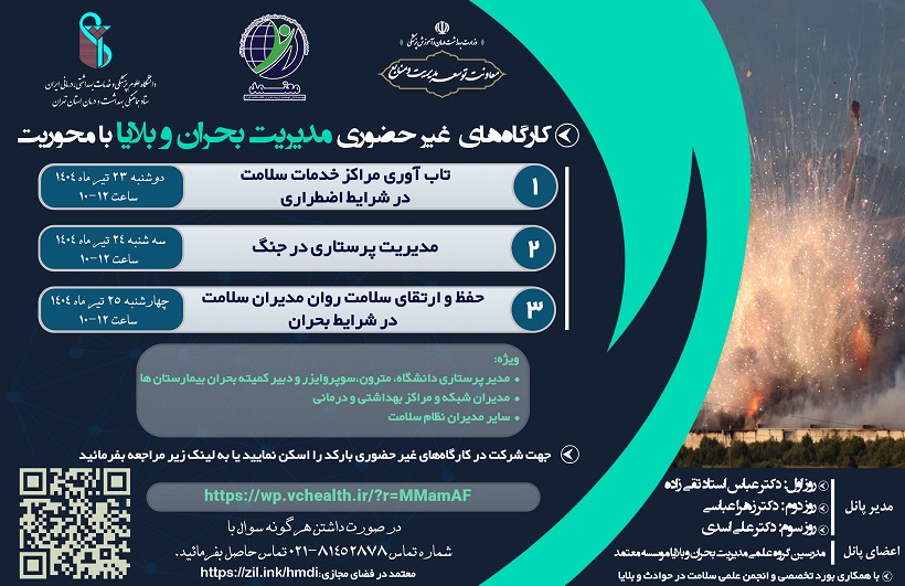 به اطلاع می رساند پیرو برگزاری سلسله کارگاه های غیر حضوری، مدیریت بحران و بلایا موسسه عالی توسعه و تربیت مدیران نظام سلامت (معتمد)، با توجه به ضرورت آمادگی در برابر بحران ها و شرایط اضطراری، کارگاه های با محوریت تاب آوری مدیریت پرستاری و سلامت روان به شرح ذیل برگزار می گردند.
