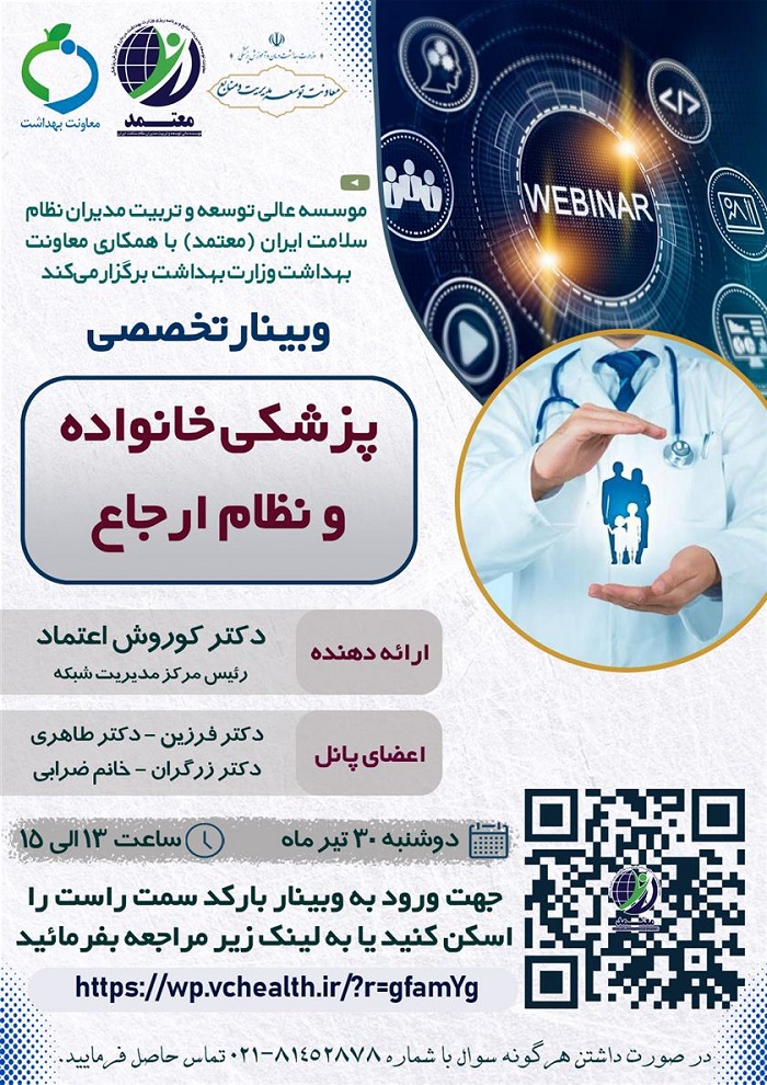 وبینار تخصصی با عنوان " پزشکی خانواده و نظام ارجاع " توسط موسسه عالی توسعه و تربیت مدیران نظام سلامت (معتمد) با همکاری معاونت بهداشت وزارت بهداشت و درمان برگزار می گردد.