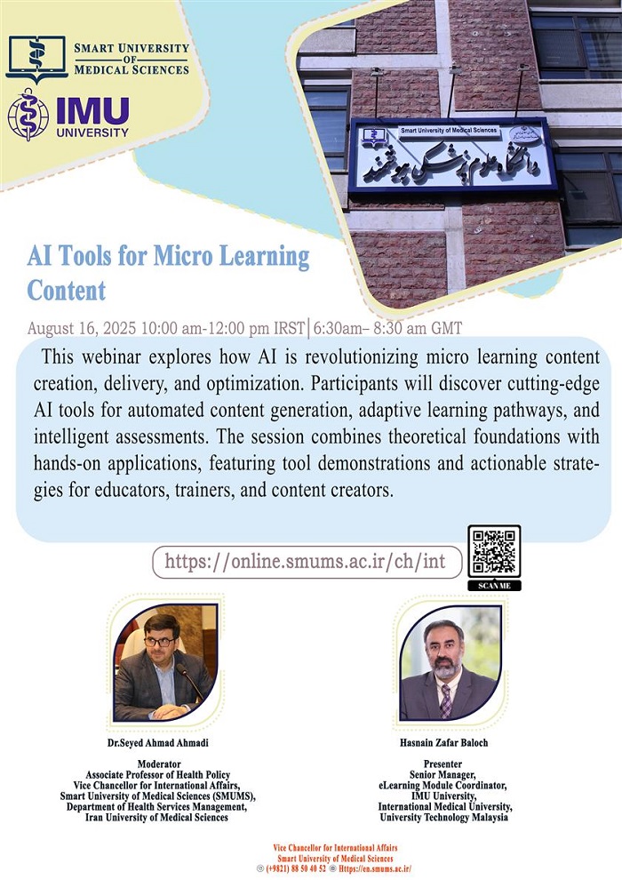 به اطلاع اعضای هیئت علمی، دانشجویان و سایر علاقه مندان می رساند، دانشگاه علوم پزشکی هوشمند در نظر دارد، سومین و آخرین وبینار بین المللی این سلسله رویدادها را با هدف تکمیل مباحث و ارائه آخرین یافته ها در حوزه فناوری های نوین آموزشی با عنوان " Al Tools for Micro Learning Conten " با سخنرانی جناب آقای حسنین ظفر بلوچ، مدیر ارشد یادگیری الکترونیک دانشگاه بین المللی پزشکی مالزی (IMU) به صورت بر خط برگزار نماید.