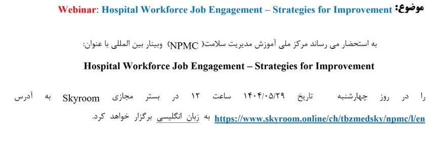وبینار آموزشی بین المللی Hospital Workforce Job Engagement – Strategies for Improvement ۲۹ مرداد ۱۴۰۴ | ۱۰:۰۱ کد : ۵۳۹۲۵ اطلاعیه ارسال به دیگران نام شما ایمیل شما ایمیل دریافتکننده ارسال انصراف تعداد بازدید:۹۳ وبینار آموزشی بین المللی Hospital Workforce Job Engagement – Strategies for Improvement