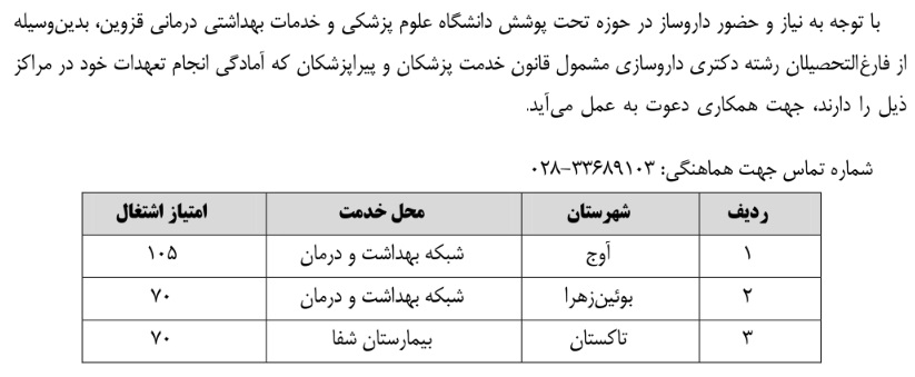جذب نیروی داروساز مشمول قانون خدمت ۲۵ آذر ۱۴۰۴ | ۰۹:۰۰ کد : ۵۷۰۵۷ اطلاعیه ارسال به دیگران نام شما ایمیل شما ایمیل دریافتکننده ارسال انصراف تعداد بازدید:۱۷۵۵ جذب نیروی داروساز مشمول قانون خدمت در دانشگاه علوم پزشکی قزوین