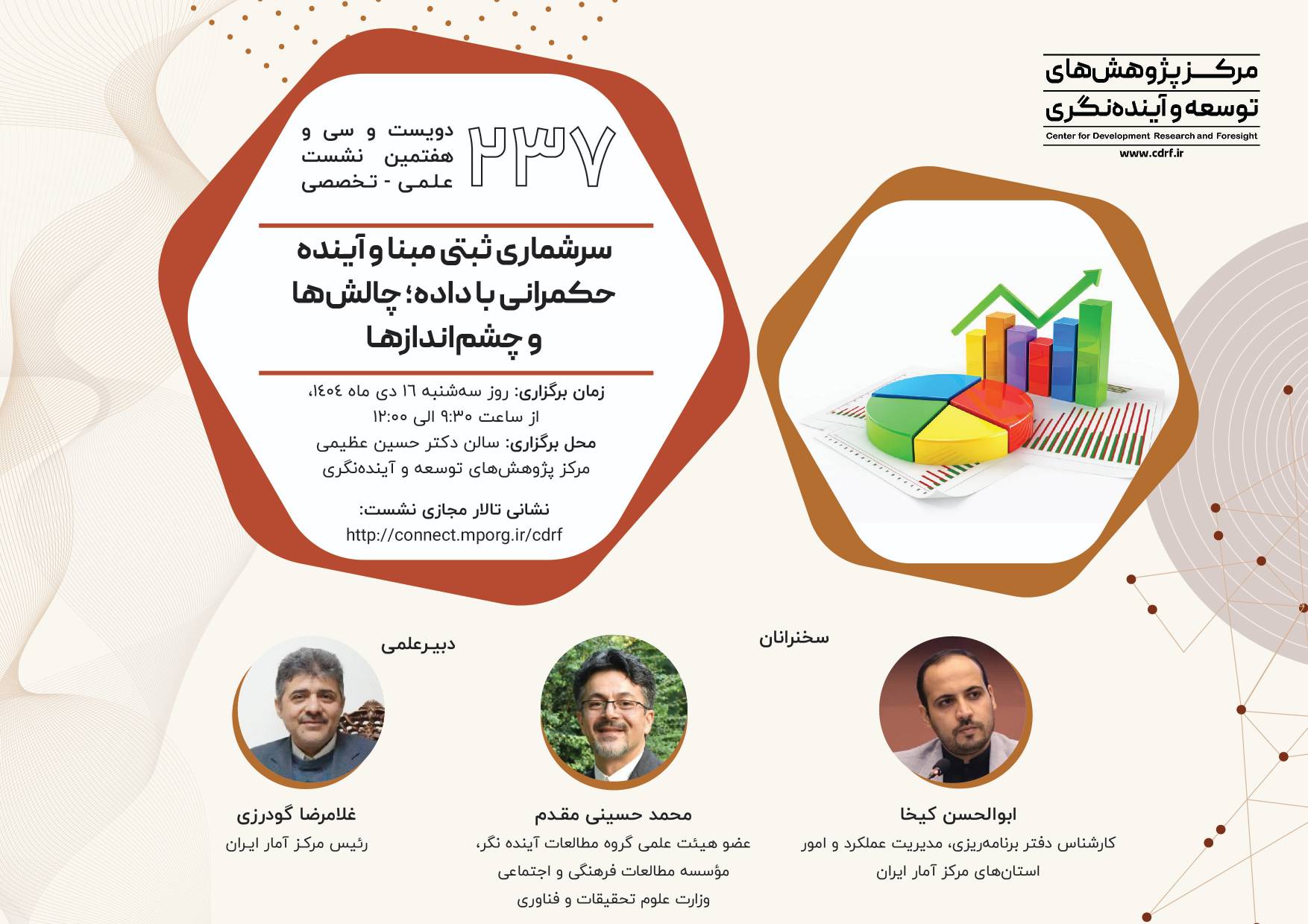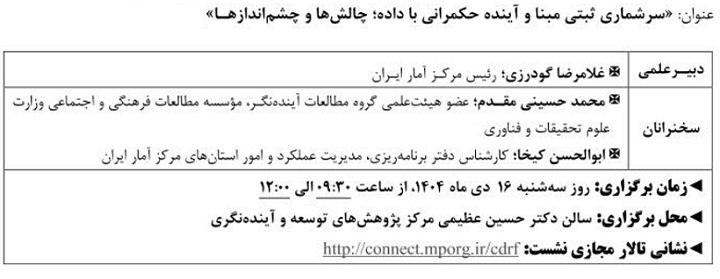 نشست علمی سرشماری ثبتی مبنا آینده حکمرانی با داده ۱۴ دی ۱۴۰۴ | ۱۰:۲۱ کد : ۵۷۴۱۸ اطلاعیه ارسال به دیگران نام شما ایمیل شما ایمیل دریافتکننده ارسال انصراف تعداد بازدید:۴۳۶ دویست وسی وهفتمین نشست علمی - تخصصی با عنوان سرشماری ثبتی مبنا آینده حکمرانی با داده، چالش ها وچشم اندازها