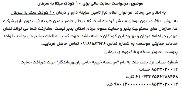 درخواست حمایت مالی، برای ۱۰ کودک مبتلا به سرطان ۰۷ بهمن ۱۴۰۴ | ۱۱:۳۳ کد : ۵۷۷۳۲ اطلاعیه ارسال به دیگران نام شما ایمیل شما ایمیل دریافتکننده ارسال انصراف تعداد بازدید:۴۸ موسسه خیریه حامی یار، درخواست حمایت مالی، برای ۱۰ کودک مبتلا به سرطان را دارد.