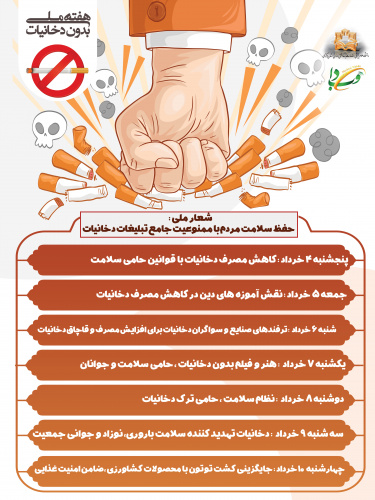روز شمار هفته ملی بدون دخانیات (۴ لغایت ۱۰ خردادماه) ۰۶ خرداد ۱۴۰۲ | ۰۹:۵۲ کد : ۳۴۶۳۳ اخبار اصلی ارسال به دیگران نام شما ایمیل شما ایمیل دریافتکننده ارسال انصراف تعداد بازدید:۳۰۳ شعار ملی: حفظ سلامت مردم با ممنوعیت جامع تبلیغات دخانیات شعار جهانی: ما به غذا نیاز داریم، نه به دخانیات