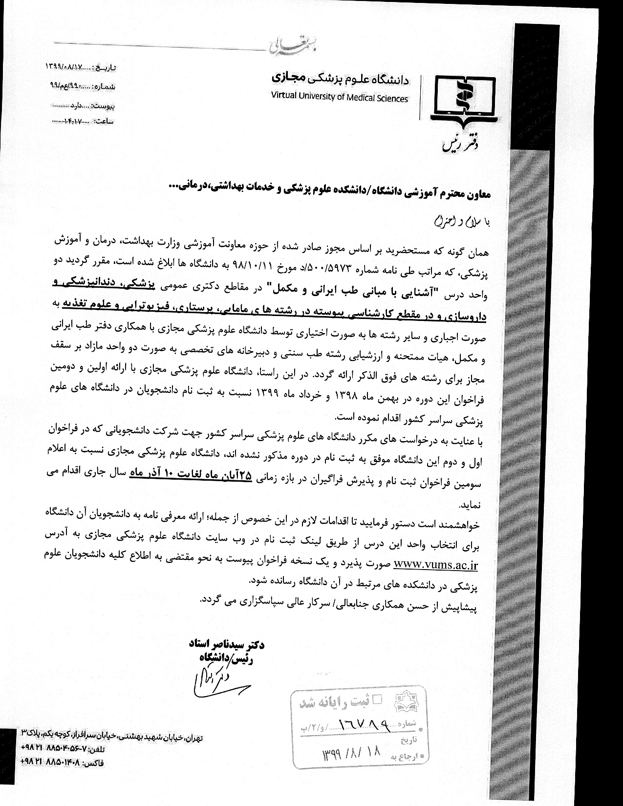 فراخوان ثبت نام آشنایی با مبانی طب ایرانی و مکمل در دانشگاه علوم پزشکی مجازی ۰۳ آذر ۱۳۹۹ | ۱۲:۴۴ کد : ۱۳۴۷۸ اخبار ارسال به دیگران نام شما ایمیل شما ایمیل دریافتکننده ارسال انصراف تعداد بازدید:۸۱۰