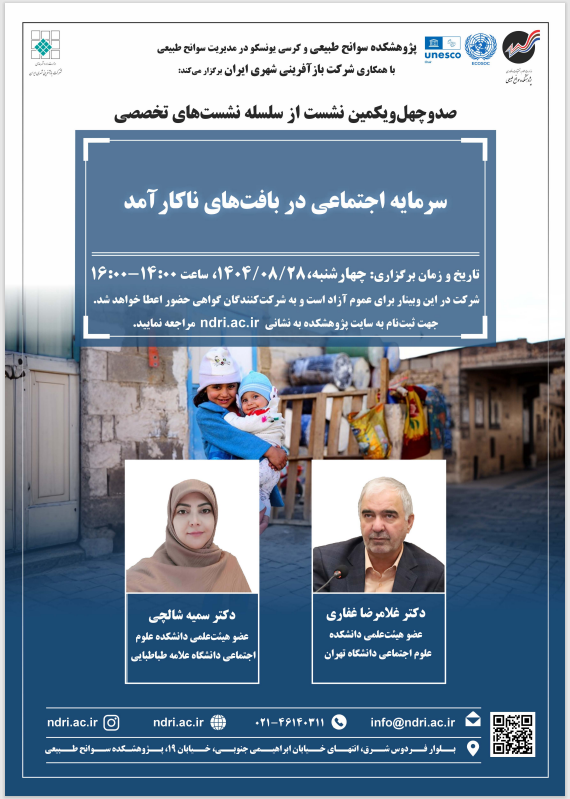 صد و چهل و یکمین نشست از سلسله نشستهای تخصصی با عنوان سرمایه اجتماعی در بافت های ناکار آمد در روز چهارشنبه مورخ ۱۴۰۴/۰۸/۲۸ ساعت ۱۴:۰۰ الی ۱۶:۰۰ توسط پژوهشکده سوانح طبیعی و کرسی یونسکو در مدیریت سوانح طبیعی با همکاری شرکت بازآفرینی شهری ایران به صورت برخط برگزار میگردد.
