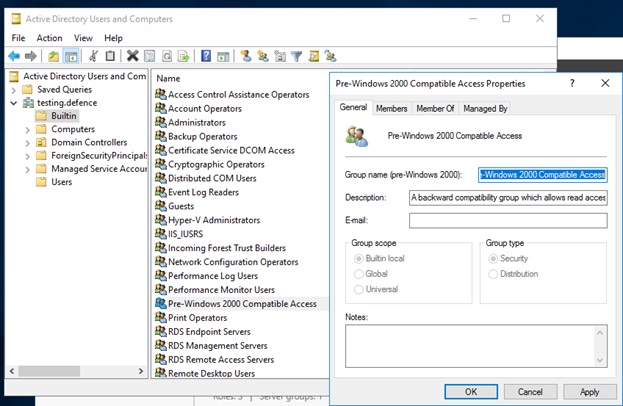 از منو درختی سمت چپ روی نام دامنه دابل کلیک کنید تا زیر مجموعه آن قابل رویت گردد گزینه Builtin را انتخاب کنید سپس بر روی Pre-Windows 2000 Compatible Access دابل کلیک کنید از سربرگ Members اعضای گروه را مشاهده نمائید اگر گروه های  "Anonymous Logon", "Authenticated Users" و یا "Everyone" وجود داشت آنها را Remove  کنید.