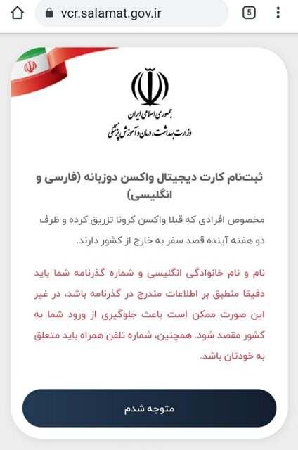صدور کارت دیجیتال واکسن کرونا برای سفر به خارج از کشور
