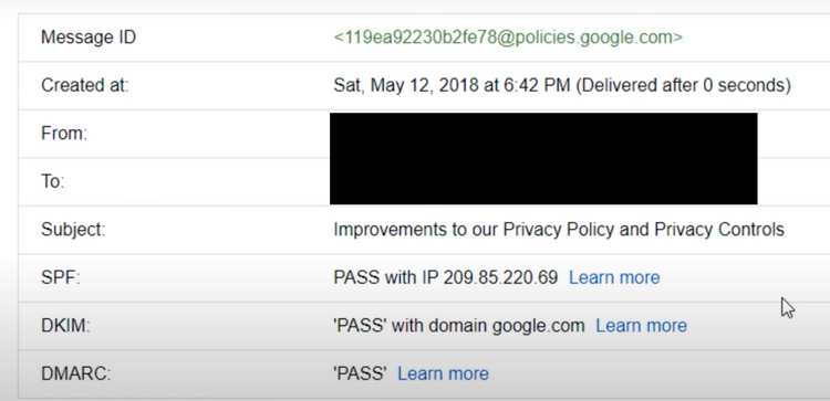 برای بررسی معیارهای امنیتی هر ایمیل، روی آیکن سه نقطه در گوشه ایمیل کلیک کنید و سپس گزینه Show Original را انتخاب نمایید. سرویسدهندههای گوناگون ممکن است نامهای متفاوتی برای این گزینه در نظر گرفته باشند، اما معمولاً در تمامی آنها چنین موردی یافت میشود. اکنون میتوانید رعایت هر کدام از پروتکلها توسط ایمیل را مشاهده کنید. اگرچه وضعیت رد یا قبول یک استاندارد نمیتواند مشخص کند که ایمیل واقعی است یا نه؛ اما میتواند به عنوان نشانه خوبی تلقی شود.