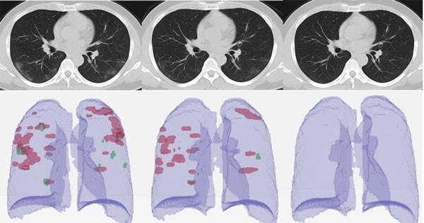 لکههای به وجود آمده در نتیجه آزمایش سی تی اسکن بیمار مبتلا به کرونا نشان دهنده ایجاد مایع در ریههای فرد و درگیری آنها با ویروس است. حال میزان درگیری ریهها به تشخیص پزشک معالج فرد مبتلا اعلائم میشود.