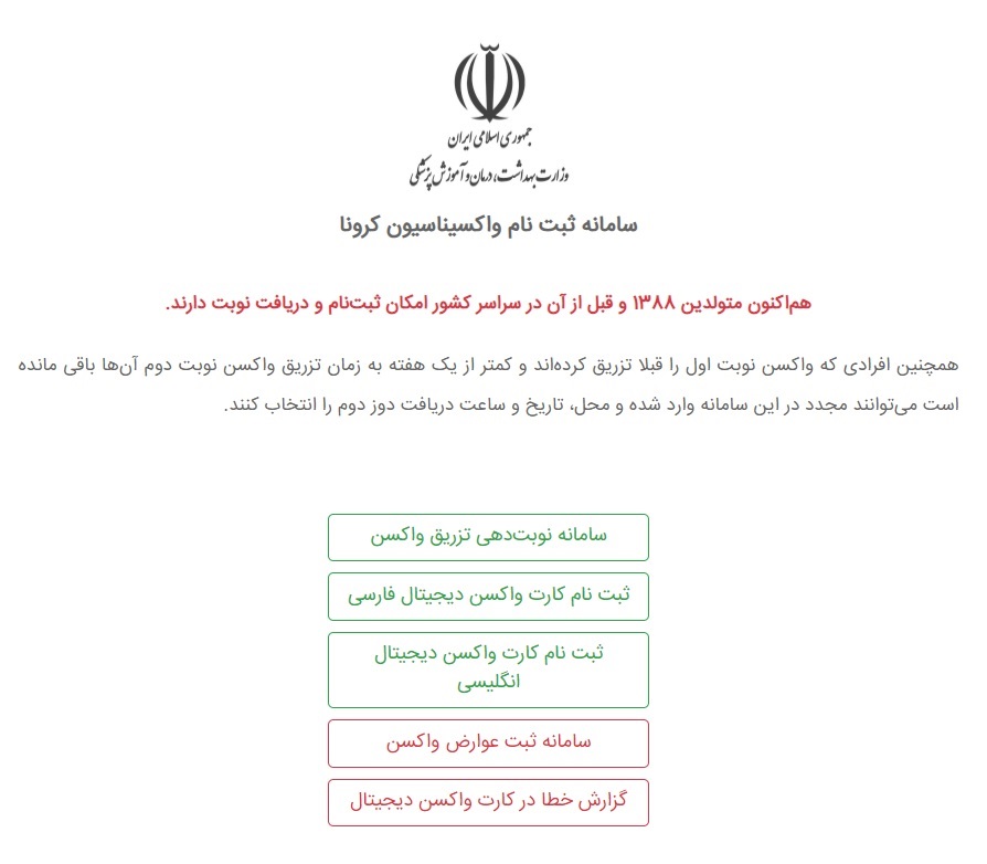 همین موضوع باعث شد تا مرکز آمار و فناوری اطلاعات وزارت بهداشت ابتدا سامانهای را برای صدور کارت دیجیتال واکسن و مسافرت به کشورهای خارجی راهاندازی کند. این سامانه با نشانی vcr.salamat.gov.ir در دسترس است و کارت واکسن را به دو زبان فارسی و انگلیسی صادر میکند. سپس سامانهی دیگری به نشانی vcr.salamat.gov.ir/fa دراختیار دیگر شهروندان قرار گرفت تا برای دریافت خدمات مختلف اجتماعی از آنها طلب شود؛ اما تا روز گذشته این سامانه تنها برای متولیدن ۱۲۸۰ تا ۱۳۲۰ فعال بود. درنهایت صبح امروز، ۹ مهرماه، سامانه جامع واکسیناسیون برای ثبتنام کارت دیجیتال واکسن کرونا برای عموم مردم معرفی شد.