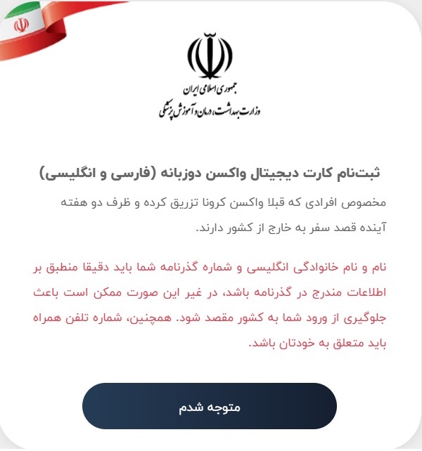 وزارت بهداشت اخطار میدهد که اگر نام و نام خانوادگی انگلیسی و شماره گذرنامه شما دقیقا منطبق بر اطلاعات مندرج در گذرنامه نباشد، ممکن است از ورود شما به کشور مقصد جلوگیری شود. پس از وارد کردن اطلاعات زیر، یک کد تأیید به شماره تلفن ثبتنامی که باید متعلق به خود فرد باشد، ارسال میشود.