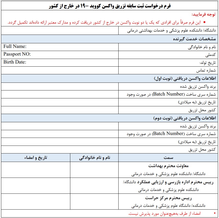 دریافت کارت واکسن برای افرادی که بخشی یا تمام روند واکسیناسیون خود را خارج از کشور سپری کردهاند، مطابق شیوهنامه معاونت بهداشت وزارت بهداشت انجام میشود. ابتدا کمیتهای متشکل از معاون بهداشت، رئیس مرکز حراست، رئیس اداره بازرسی و ارزیابی عملکرد دانشگاههای علوم پزشکی باید با بررسی اسناد مربوط به سفر شخص به خارج کشور و کارت واکسن وی، صورتجلسهای را برای تنظیم یک فرم آماده کنند. فرم مشابه نمونه زیر خواهد بود:
