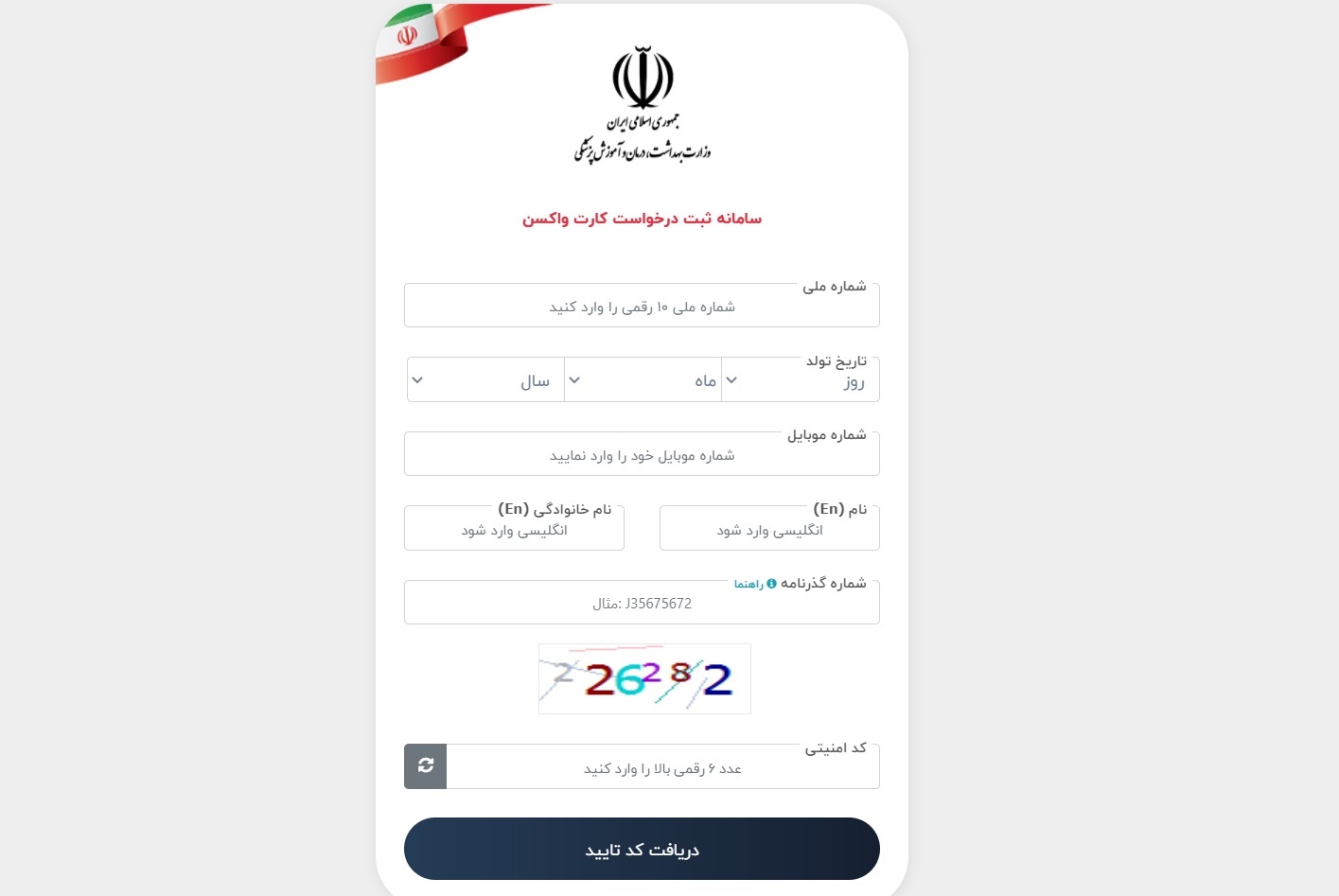 پس از وارد شدن به سامانه واکسیناسیون و انتخاب گزینه ثبتنام کارت واکسن دیجیتال فارسی، شما به سامانه ثبت درخواست کارت واکسن با نشانی vcr.salamat.gov.ir/fa هدایت میشوید.