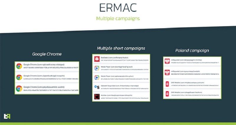 Cengiz Han Sahin، مدیرعامل ThreatFabric، در بیانیهای از طریق ایمیل گفت: «تروجان جدید در حال حاضر کمپینهای توزیع فعال دارد و 378 برنامه بانکی و کیف پول را با همپوشانی هدف قرار میدهد.» اعتقاد بر این است که اولین کمپینهای مربوط به ERMAC در اواخر ماه اوت تحت پوشش برنامه Google Chrome آغازشده است. از آن زمان، حملات به طیف وسیعی از برنامهها مانند بانک، پخشکننده رسانه، خدمات تحویل، برنامههای دولتی و برنامه های ضدویروس مانند McAfee گسترشیافته است.