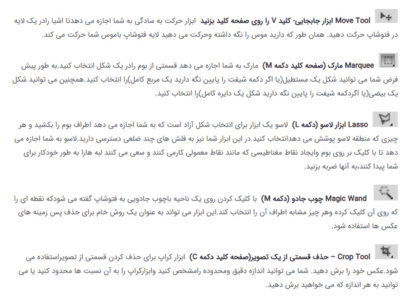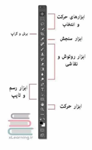 بخش نوار ابزار که مهم ترین قسمت فتوشاپ است شامل ابزارهای زیر می باشد