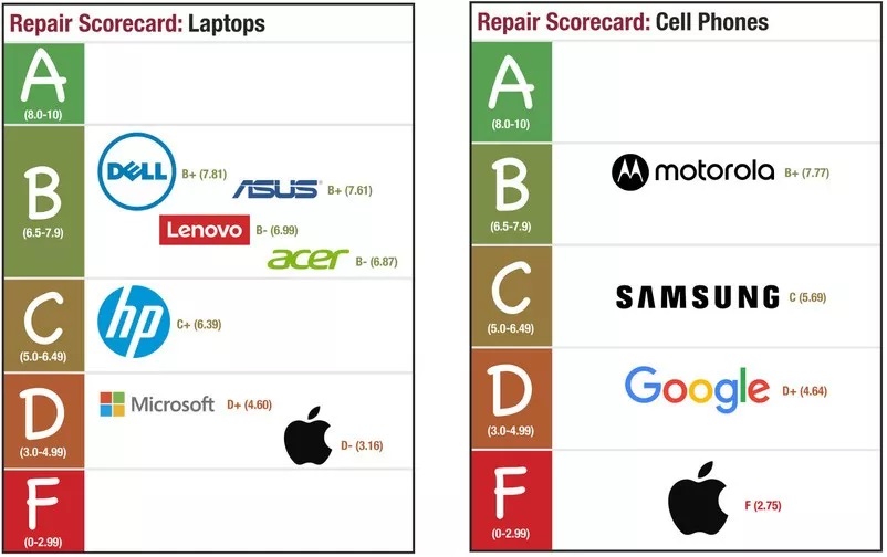 گفتنی است که وضعیت اپل نیز در جدول امتیازات تعمیرپذیری، چه در بخش لپتاپ و چه در بخش تلفنهای همراه تعریفی ندارد. در کارت امتیازات تعمیرپذیری تلفن همراه، اپل با امتیاز ۲٫۷۵، پایینتر از شرکتهای موتورولا، سامسونگ و گوگل در ردهی F جای میگیرد و در کارت امتیازات تعمیرپذیری لپتاپها با امتیاز ۳٫۱۶ در پایینترین رتبه و ردهی -D قرار دارد.