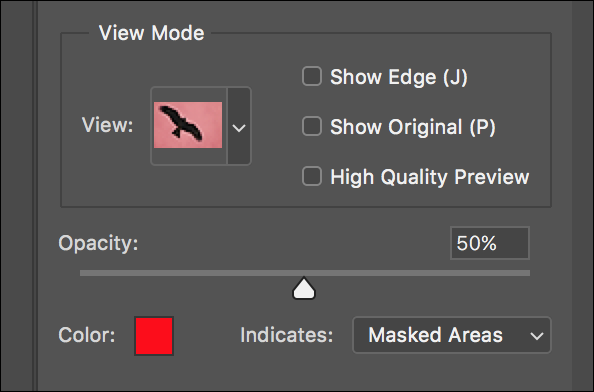 برخی View Modes گزینه تغییر رنگ، تار کردن یا شفاف کردن دارند. شما میتوانید این عکس را به View Mode Options تغییر دهید. اگر بخش Show Edge چک شد، برنامه فتوشاپ مناطقی را که در آن لبه ها را در نظر گرفته، مشخص میکند.