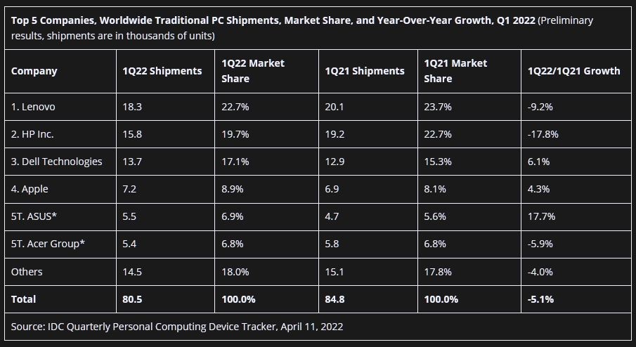 بهگفتهی سازمان بینالمللی داده (IDC)، با اینکه پنج رتبهی اول جایگاه خود را حفظ کردهاند، آمار فروش هرکدام درمقایسهبا سال گذشته افزایش یافته است. ناگفته نماند دادهها از عملکرد چشمگیر ایسوس در این مدت خبر میدهند. بااینحال، دل و اپل نیز در سهماههی اول ۲۰۲۲ درمقایسهبا بازهی زمانی مشابه سال گذشته دستگاههای بیشتری فروختند و اپل حتی موفق شد در ایالات متحده ۱۸ درصد رشد فروش را تجربه کند.