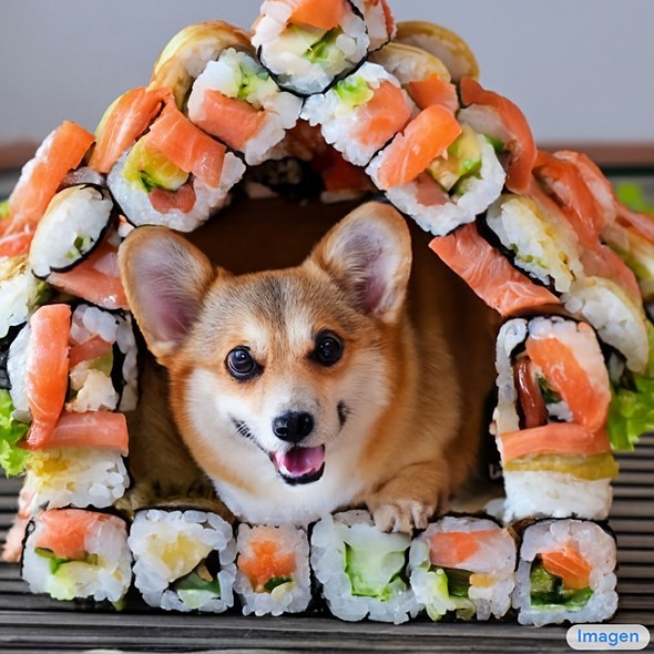 بهعنوان مثال، تصویر زیر که از متن «a cute corgi lives in a house made out of sushi» (یک سگ نژاد کورگی که زیر خانهی ساختهشده از سوشی زندگی میکند) را در نظر بگیرد. این تصویر بهشکل شگفتانگیزی واقعگرایانه و باورپذیر است، طوری که انگار واقعاً کسی یک خانه از سوشی برای آن سگ درست کرده است.
