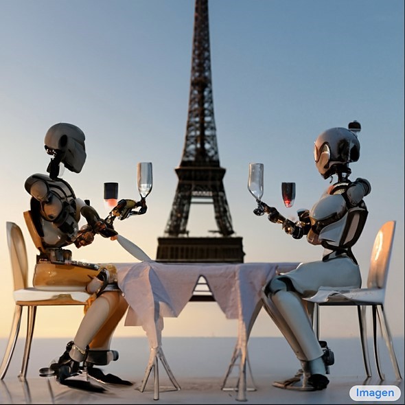 A robot couple fine dining with Eiffel Tower in the backgrounda