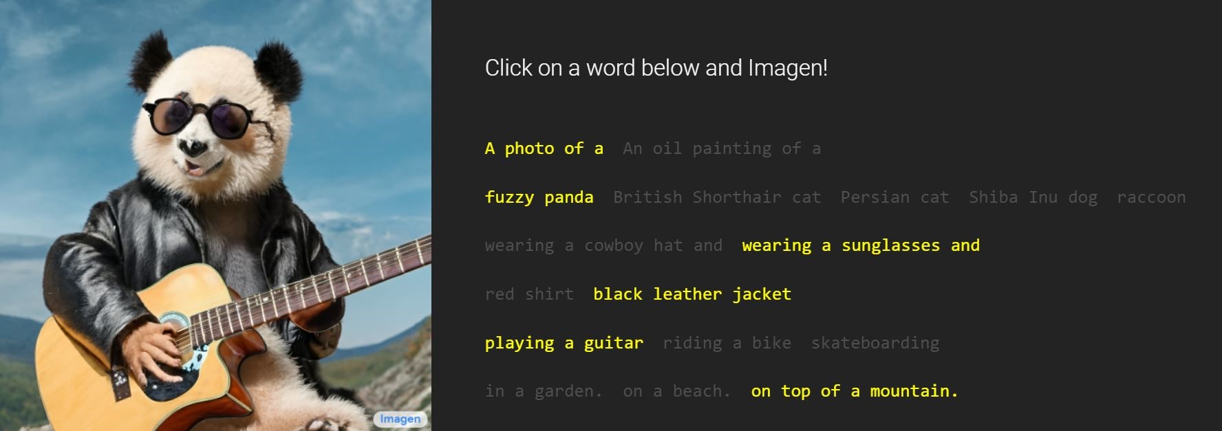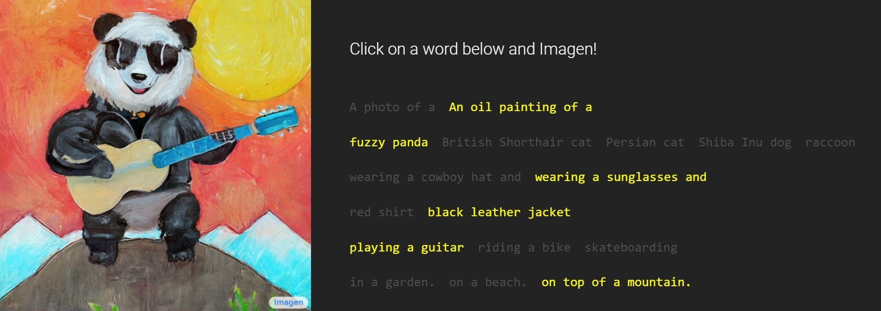 نتایج سیستم جدید جالب توجه هستند. Imagen با گرفتن یک ورودی متنی مثلاً «یک سگ که کلاه آبی و لباس قرمز پوشیده» کار خود را شروع میکند و سپس رمزگذار T5-XXL آن متن ورودی را تبدیل به توابع ریاضیاتی میکند. سپس این توابع به یک عکس کوچک ۶۴ در ۶۴ پیکسلی تبدیل میشوند. Imagen این عکس کوچک را به یک عکس ۲۵۶ در ۲۵۶ پیکسلی و ۱۰۲۴ در ۱۰۲۴ پیکسلی تبدیل میکند.