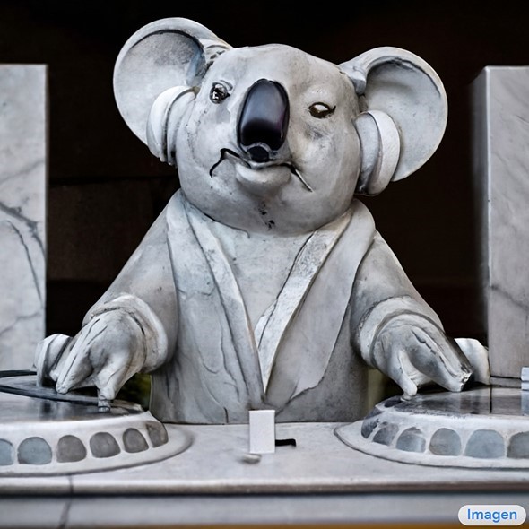 ‘A marble statue of a koala DJ in front of a marble statue of a turntable. The koala is wearing large marble headphones.’