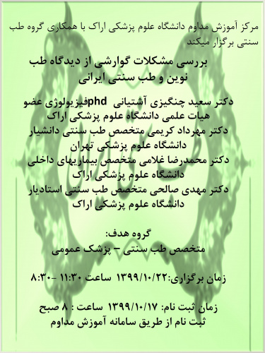 مرکز آموزش مداوم دانشگاه علوم پزشکی اراک با همکاری گروه طب سنتی برگزار میکند