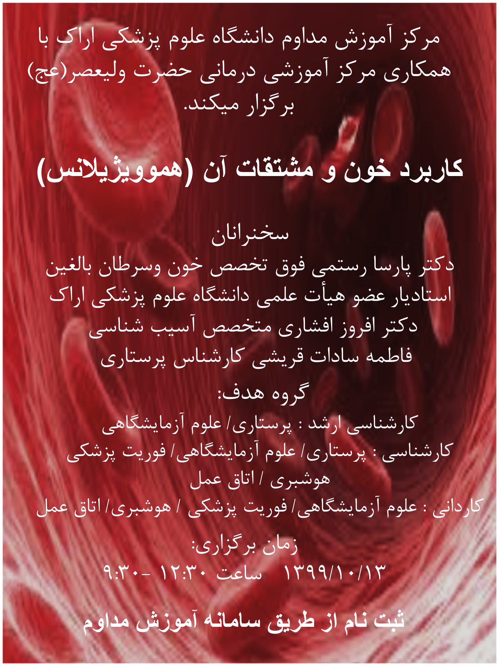 | 1399/11/26 | 8:15-10:30 | هموویژیلانس | مرکز آموزشی درمانی امیرکبیر | 1399/11/18 | 9 |