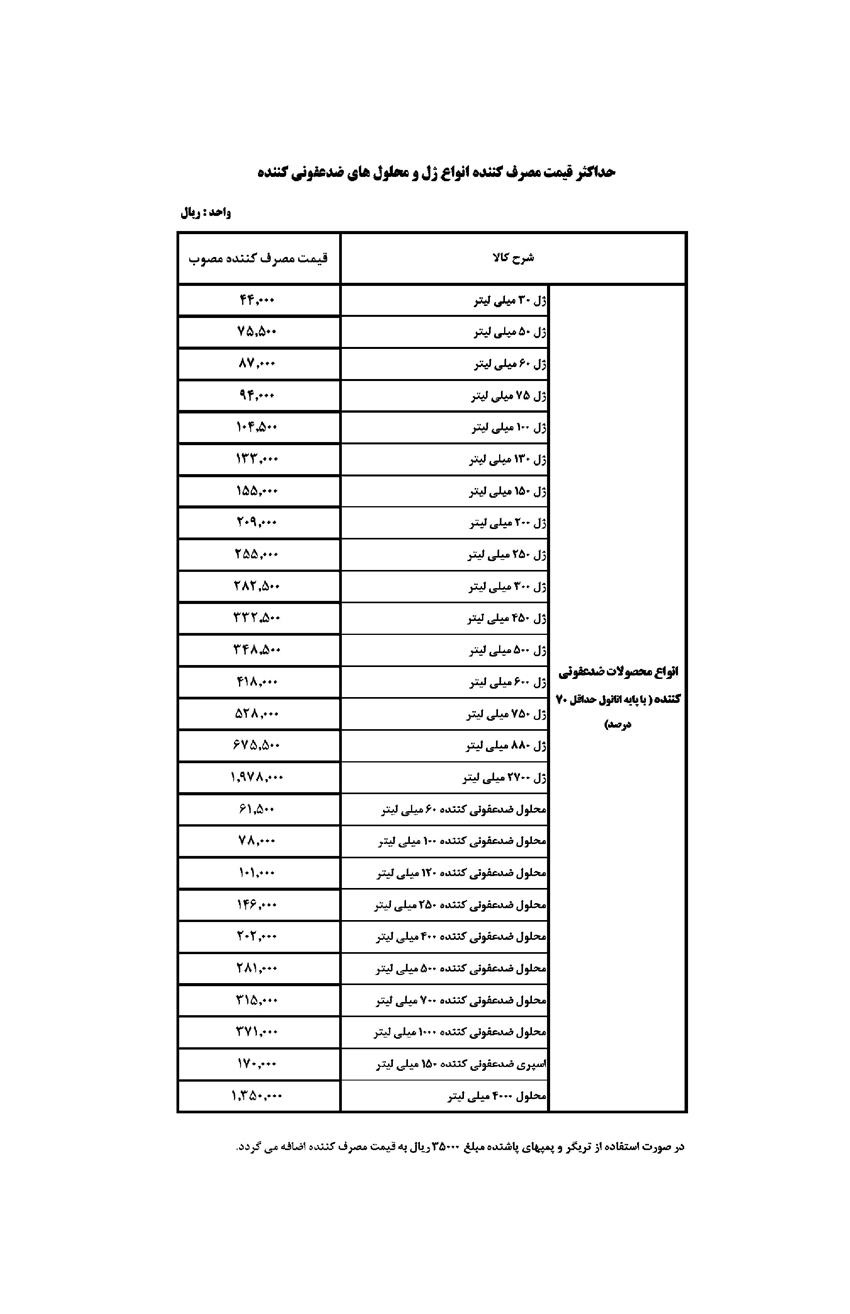 به اطلاع میرساند لیست آخرین قیمت مصرف کننده انواع ژل و محلول های ضدعفونی کننده با پایه اتانول حداقل ۷۰ درصد -مصوب سازمان حمایت از مصرف کنندگان و تولیدکنندگان- که در سطح داروخانه ها و فروشگاه های بزرگ از طریق شرکت های پخش توزیع می گردند به حضورتان ارسال می گردد مقتضی است اقلام مذکور حداکثر به قیمت مصوب به فروش برسد.
