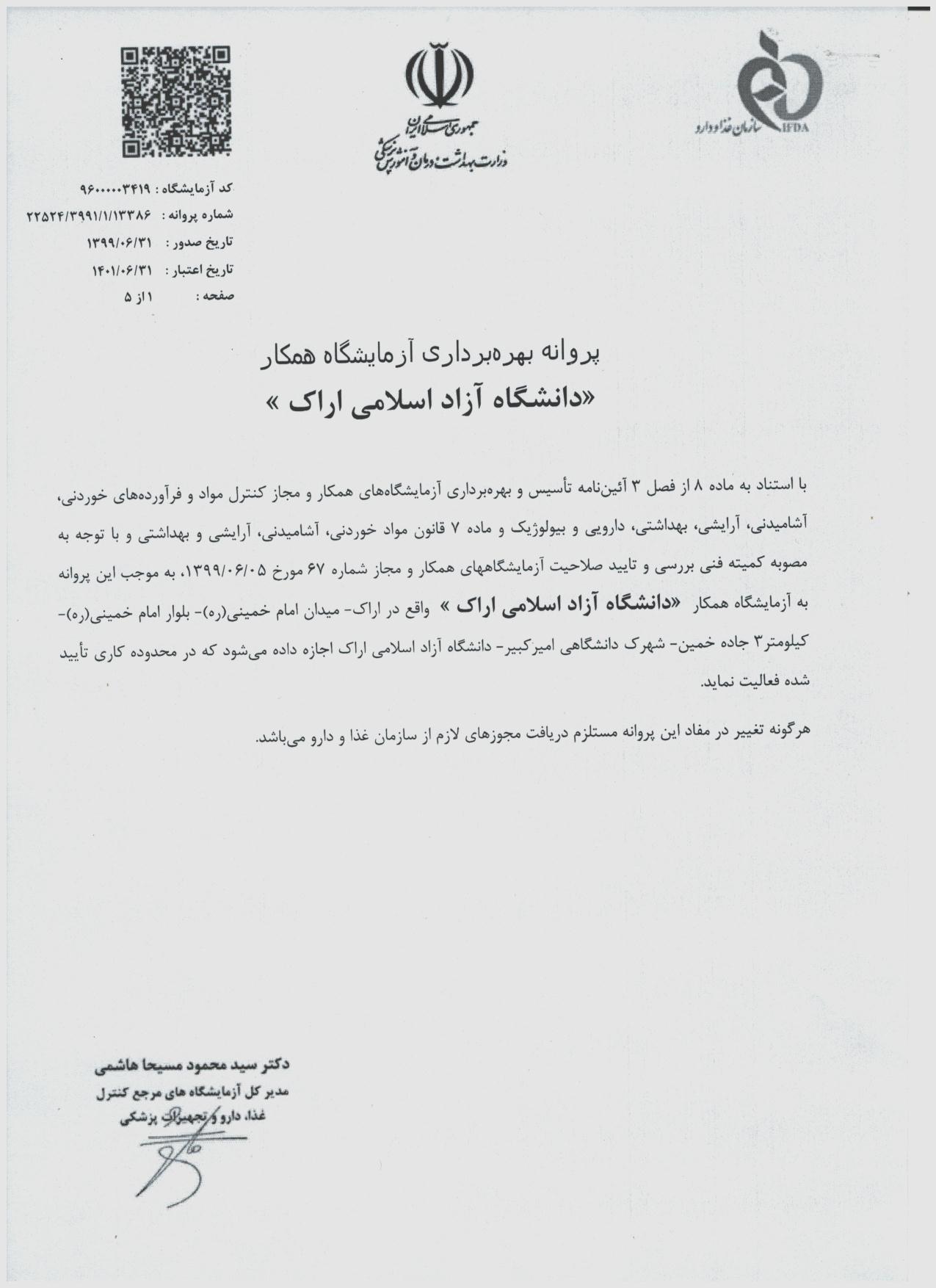 پروانه بهرهبرداری آزمایشگاه همکار غذا و داروی دانشگاه آزاد اسلامی اراک صادر شد