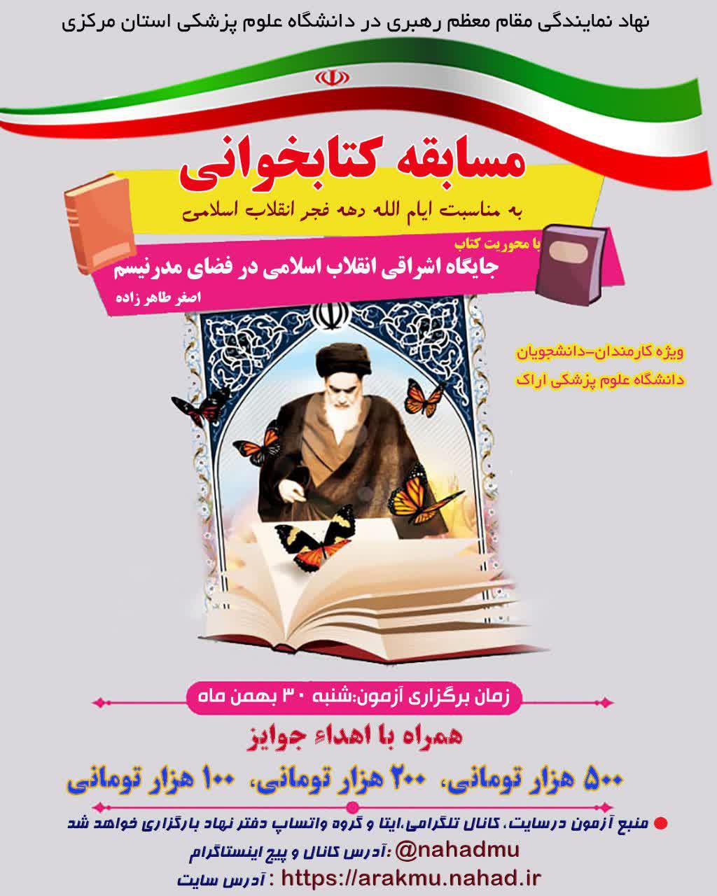 دفتر نهاد نمایندگی مقام معظم رهبری در دانشگاه علوم پزشکی اراک به مناسبت ایام الله دهه فجر انقلاب اسلامی مسابقه کتابخوانی با محوریت کتاب «جایگاه اشراقی انقلاب اسلامی در فضای مدرنیسم» ویژه کارکنان و دانشجویان دانشگاه برگزار می نماید.