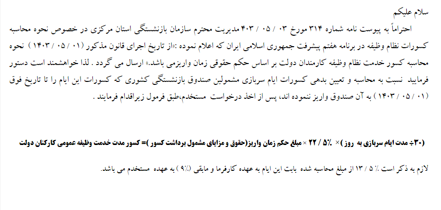 با توجه به نامه مدیریت محترم سازمان بازنشستگی استان مرکزی در خصوص نحوه محاسبه کسورات نظام وظیفه در برنامه هفتم پیشرفت جمهوری اسلامی ایران که اعلام نموده :«از تاریخ اجرای قانون مذکور (۰۱ / ۰۵ / ۱۴۰۳ ) نحوه محاسبه کسور خدمت نظام وظیفه کارمندان دولت بر اساس حکم حقوقی زمان واریزمی باشد.» ارسال می گردد . لذا خواهشمند است دستور فرمایید نسبت به محاسبه و تعیین بدهی کسورات ایام سربازی مشمولین صندوق بازنشستگی کشوری که کسورات این ایام را تا تاریخ فوق (01 / 05 / 1403 ) به آن صندوق واریز ننموده اند، پس از اخذ درخواست مستخدم،طبق فرمول زیراقدام فرمایند .