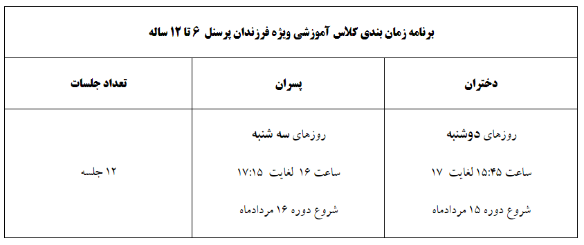 1: دختران (سه جلسه در هفته روزهای زوج ) ساعت 12 الی 13 2: پسران (سه جلسه در هفته روزهای فرد) ساعت 12 الی 13